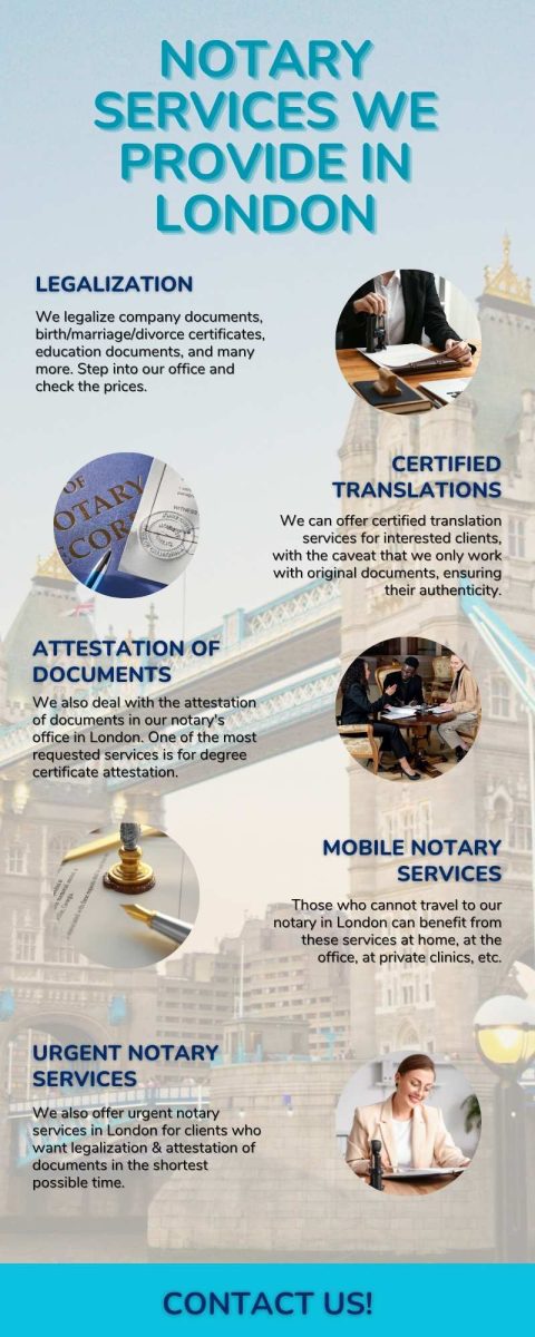 Notary services we offer in London | – legalization, – notarization, – certified translations, etc. |
